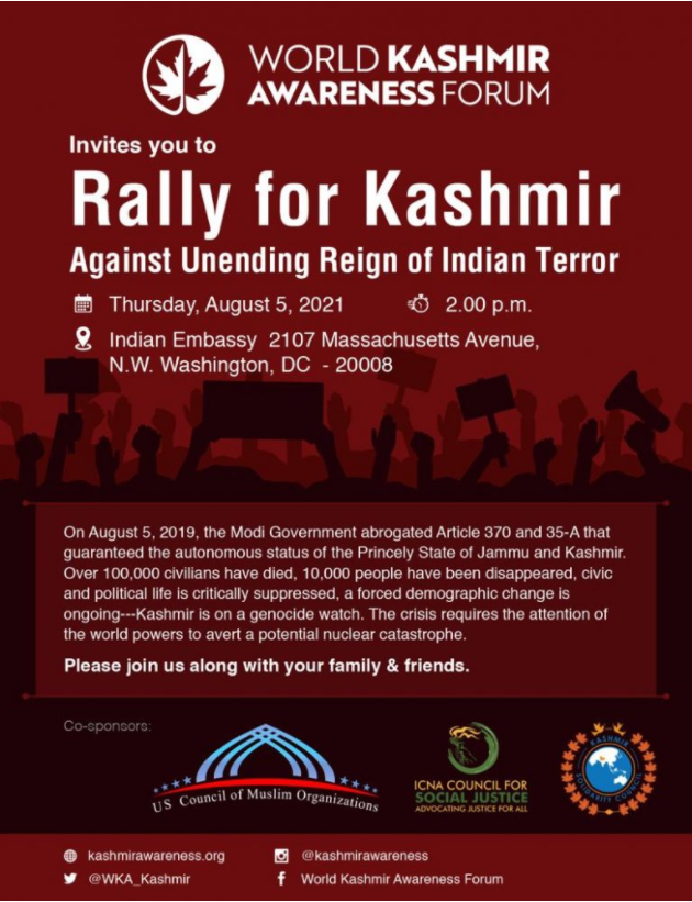 In order to protest the August 5 decision, in addition to protesting the occupation of Kashmir, please attend the rally for Kashmir in Washington DC. More details can be found on the below flyer.