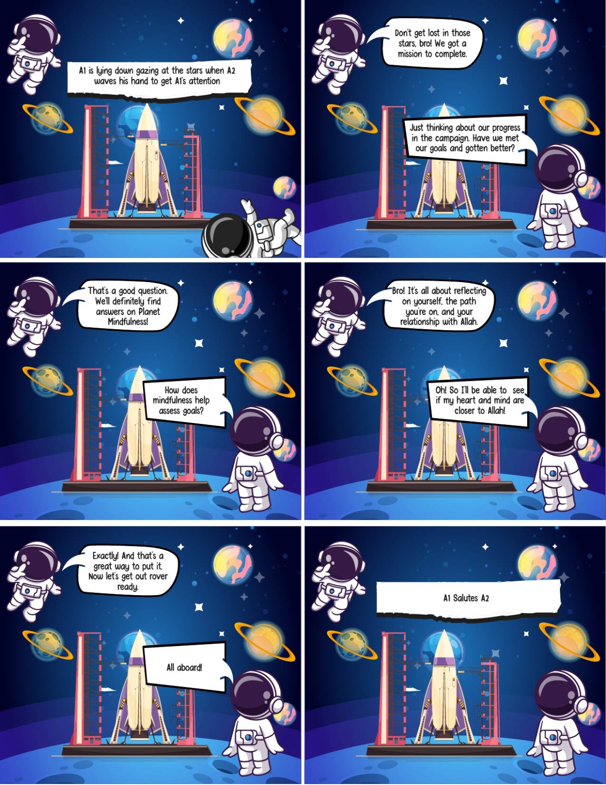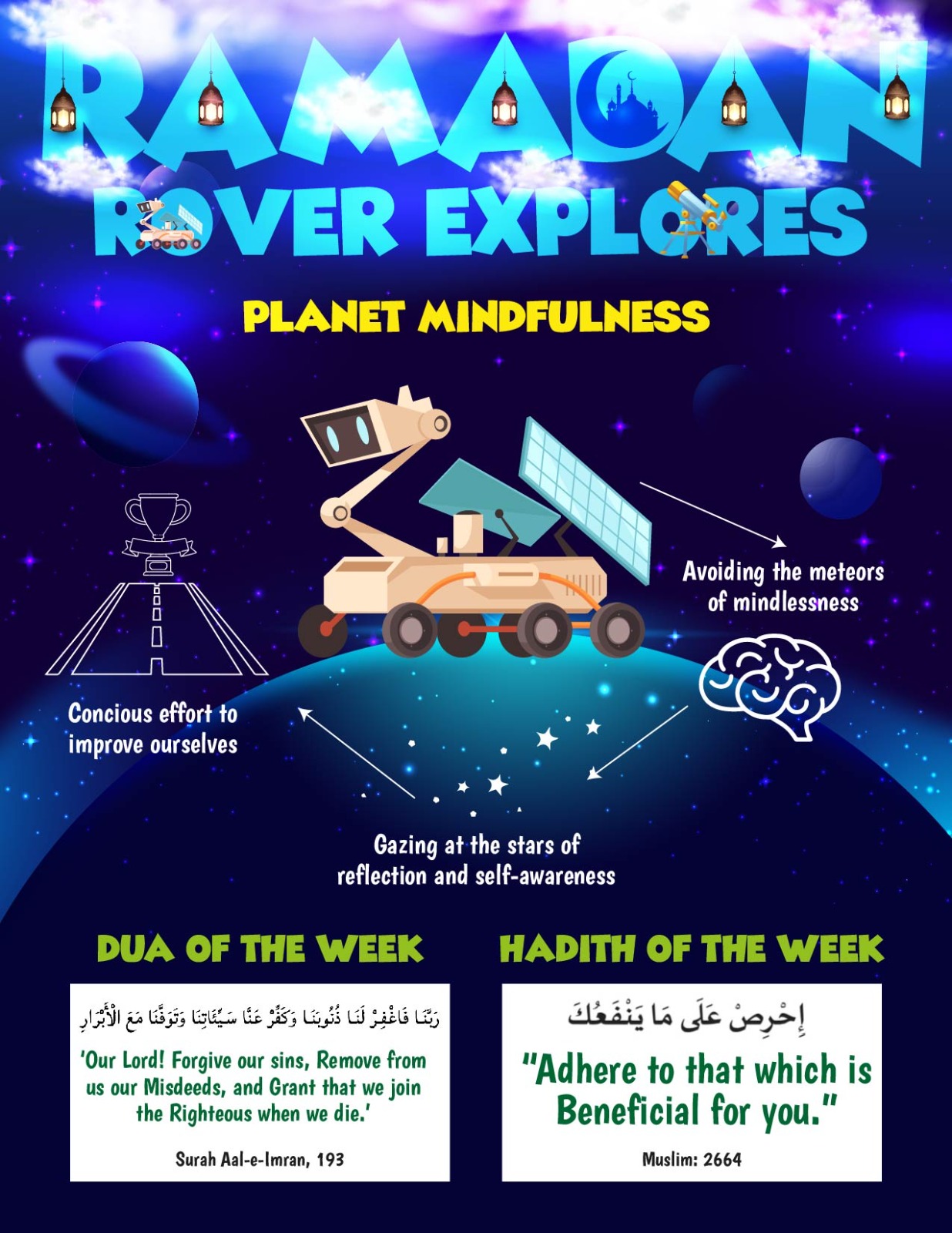 Our Rover has now landed on Planet Mindfulness and it is time to REFLECT. The month is coming to an end and so is our mission. We have to see if we made progress with our mission,. Ramadan is not just about staying away from sins and food for only a month. It is about becoming a better person and developing habits that will stay with us for the entirety of our lives.