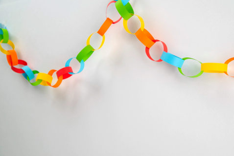 • Using a stapler or tape, join the two ends of the strip of paper that says #1 and make it into a circle. Take the strip of paper that says #2 and thread it through the first circle. Tape or staple it closed. Use each strip to make a chain attaching in order. Attach each chain either using tape or a stapler.