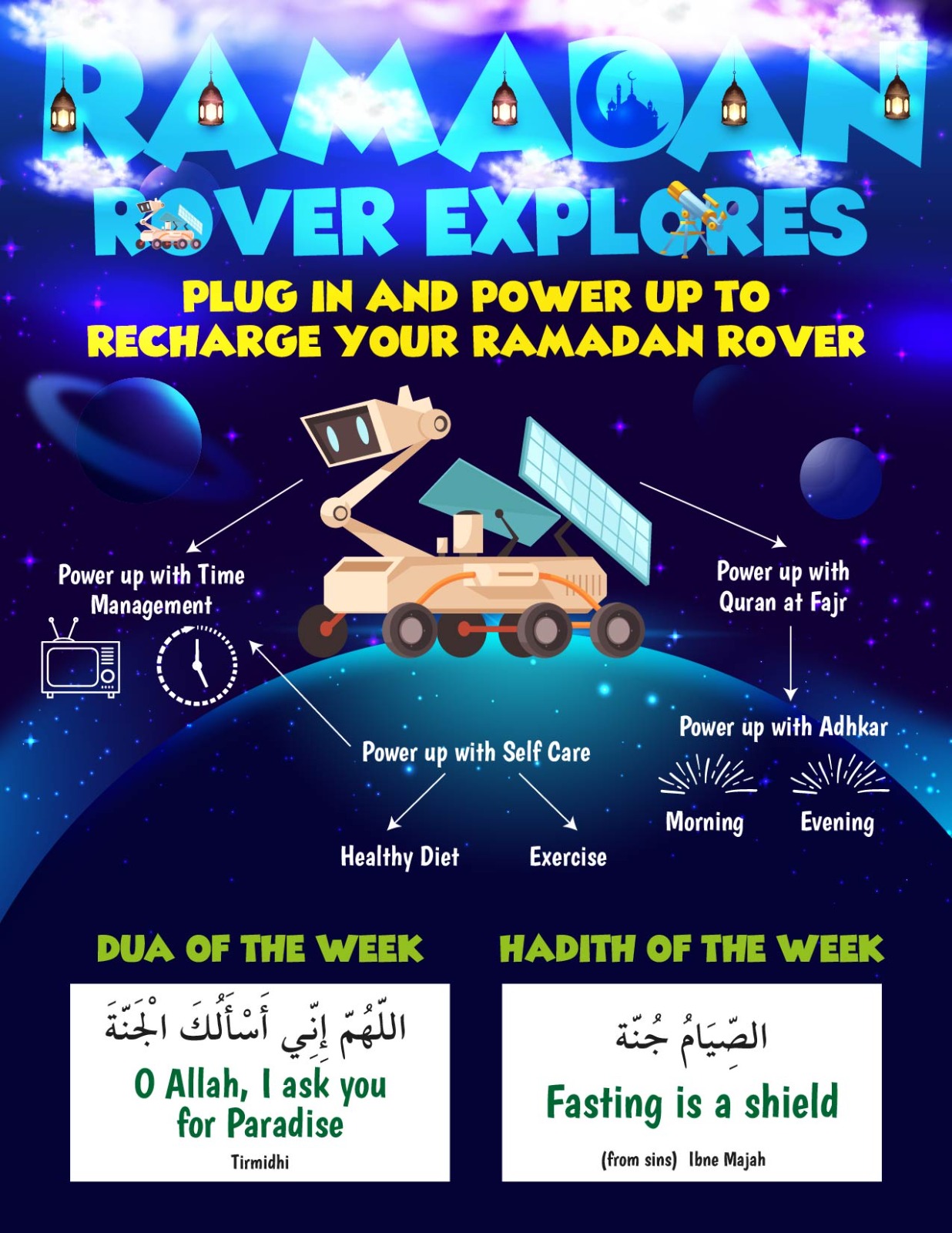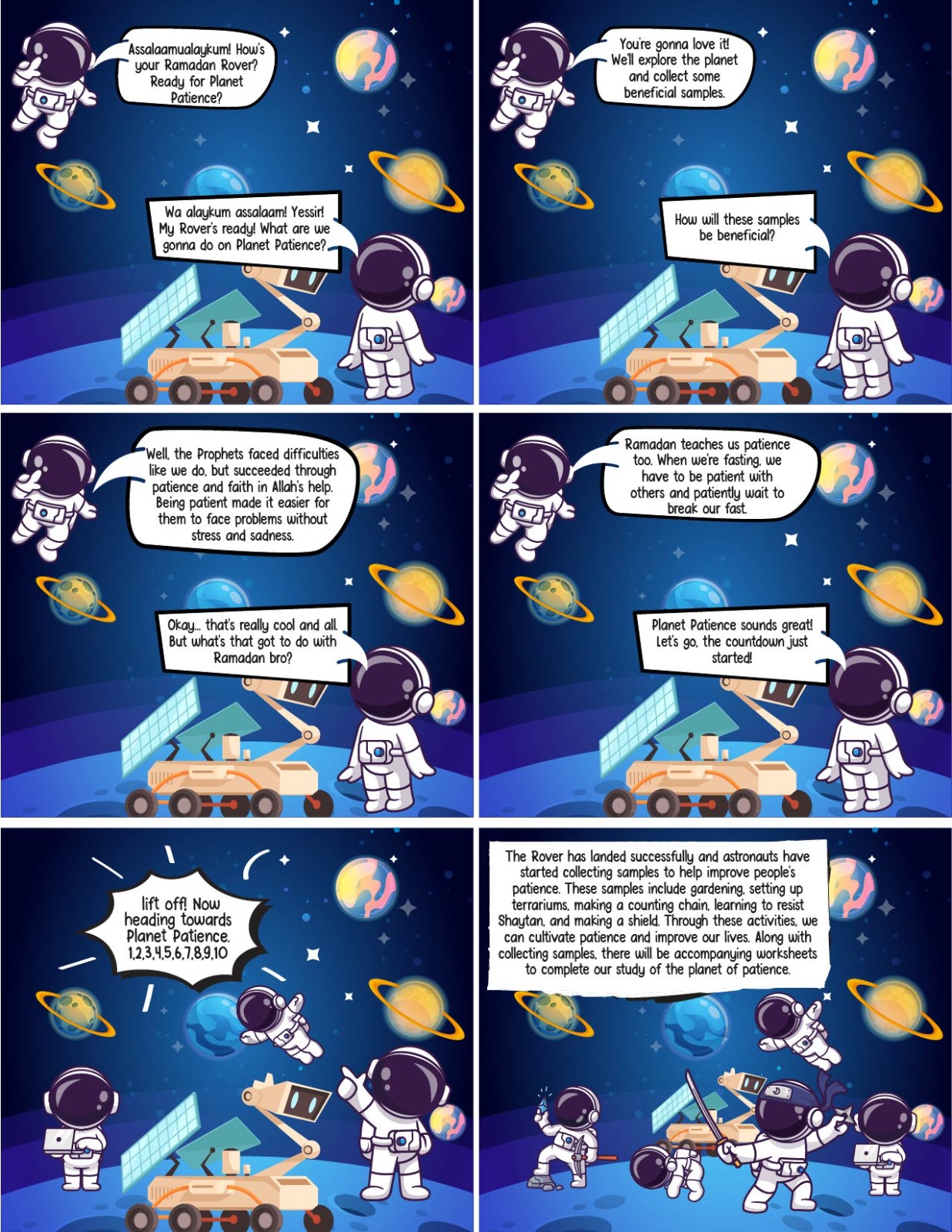 Hey kids, are you ready to refuel our Ramadan Rover? Get ready, 3…2…1… Woohoo! Our rover has landed safely on Planet Patience. Fasting for a whole day and doing it for 30 days straight might seem like an impossible task, but with patience, we can do it. When we don’t have any food to eat, even small things can annoy us. But if we have patience, we can get through it all.
