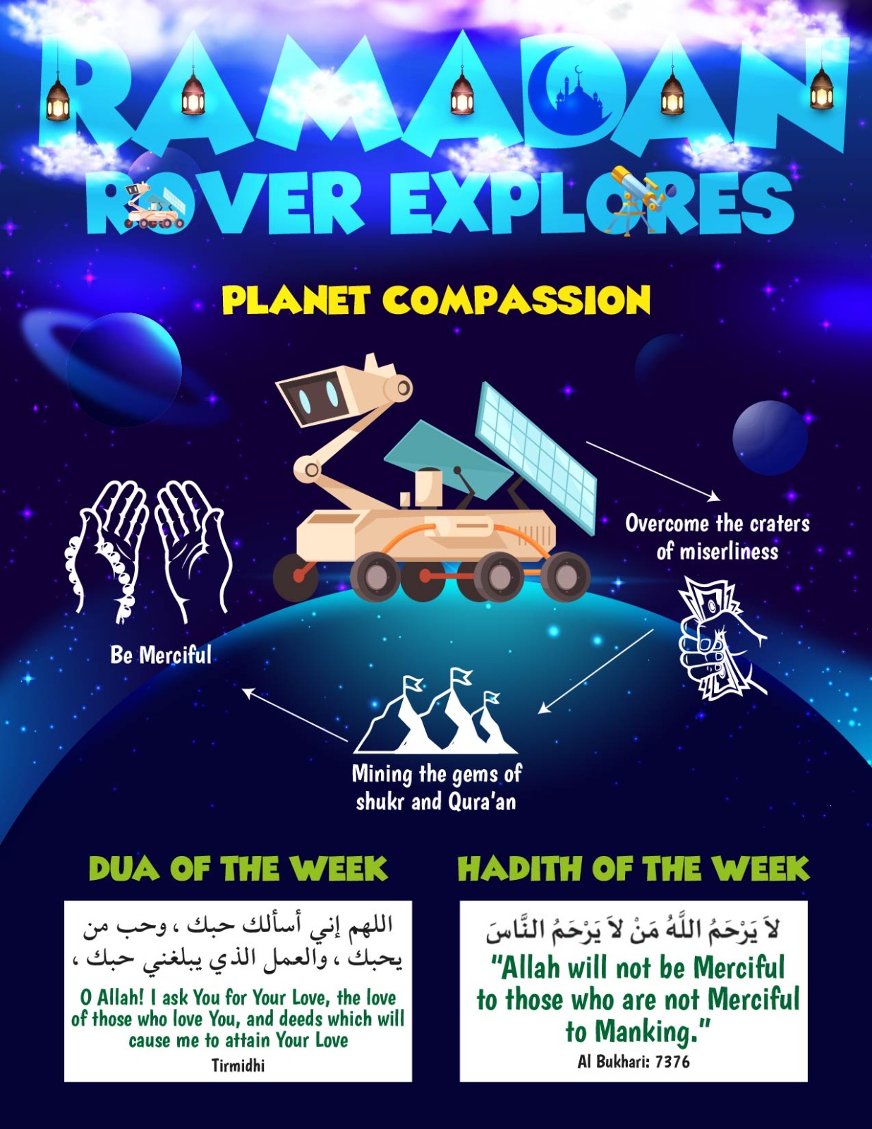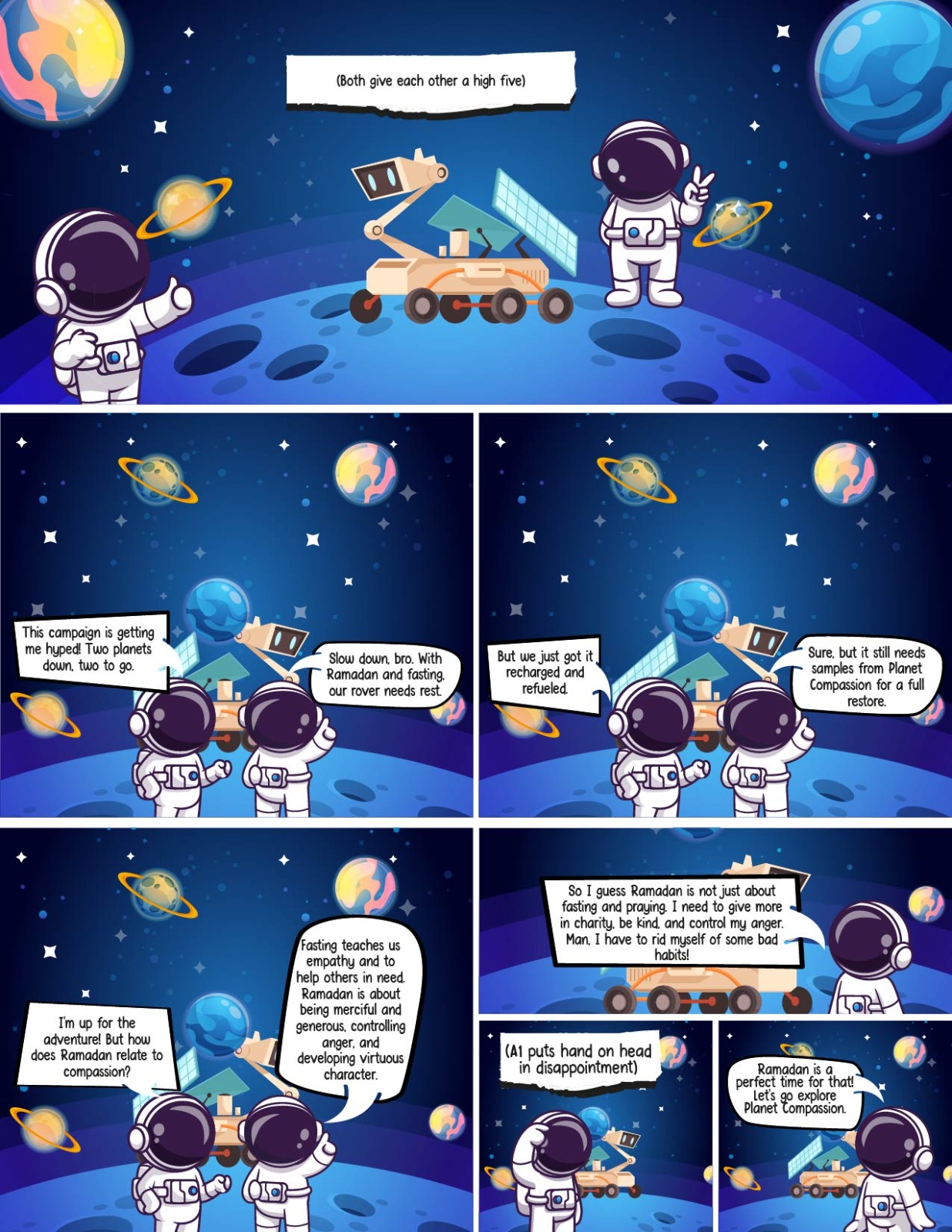 It’s time to restore our Ramadan Rover. 3…2…1…Our rover has successfully landed on Planet Compassion. Fasting teaches us self-discipline and kindness towards others when we stay away from food and all bad deeds. Ramadan is not just about fasting and praying. It is about being compassionate, merciful, and generous with others too.